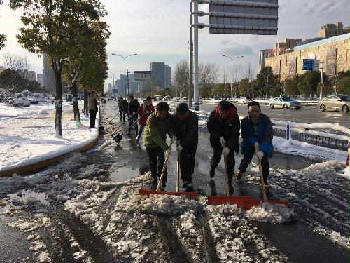 市“扫雪防冻指挥部”办公室发出扫雪通知,给各单位派了路段。我们单位小、人少,绝大多数是共产党员。清晨,外面还是冰天雪地,不到7点大家伙儿齐齐地来到责任路段,挥动铁锹、面铲,开始劳动。积雪不深,10公分多点。雪不难扫,但如果被车碾过、人踩过、压实了,再冻起来,那么铲除它要费点儿劲了。所以说,扫雪是个简单活儿,需要力气。扫雪,也需要团结合作。同伴之间协作可以提高效率。有3-4位拿面铲的并排一齐向前推铲,效果好、成效大。他们共同推过、铲过的路面似雨水浇过一样,人在上面走,地面的倒影清晰可见。
